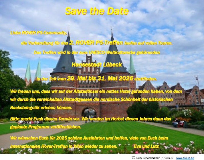 29. bis zum 31.05.2026 Liebe Rover-P5-Gemeinde, das Programm für das Rover P5-Treffen 2026 in der Zeit vom 29. bis zum 31.05.2026 in der Hansestadt Lübeck steht. Lübecks historischer Stadtkern auf … Weiterlesen